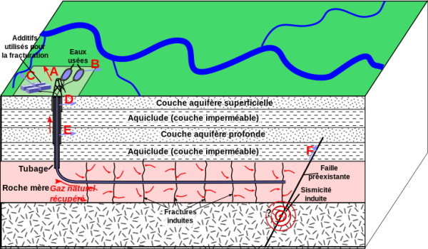 Image : Schéma des différents impacts environnementaux potentiels. A : gaz naturel relâché dans l’atmosphère, B : contamination de la surface par les eaux usées, C : prélèvement conflictuel sur les ressources en eau, D et E : contamination des couches aquifères superficielle et profonde, F : sismicité induite.