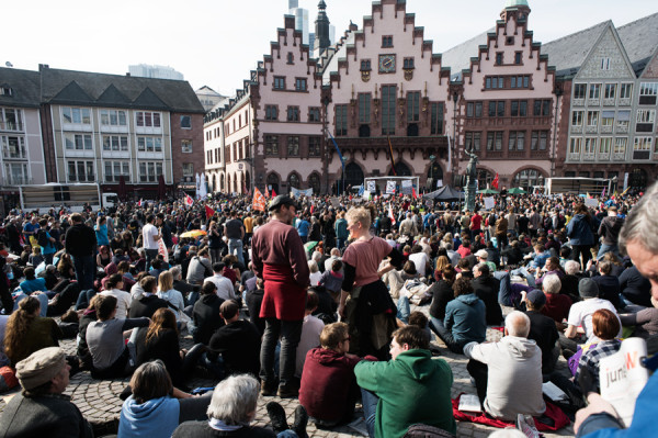 La mobilisation du 18 mars a été l’occasion d’échanges et d’expressions publiques des nombreux mouvements et organisations qui composent Blockupy : associations, syndicats, membres de partis politiques et personnalités se sont succédés devant une place de Francfort transformée en agora. Ils ont rappelé que c’est l’Europe de l’argent, de l’austérité et de la concurrence, symbolisée par la BCE, qui a conduit au désastre actuel.