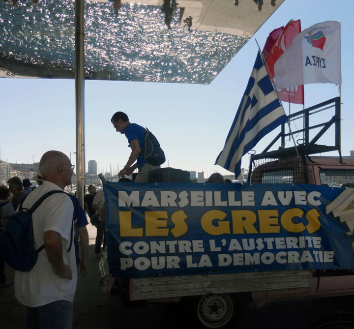 Deux cent cinquante personnes se sont réunies ce samedi à Marseille, sous le drapeau de la Grèce et de Syriza. L’Union Européenne veut faire plier la Grèce pour empêcher la voix des peuples de raisonner. L’Être Humain n’est pas en crise… il s’éveille. Une autre alternative est possible. La Grèce est un espoir pour une Europe digne, solidaire et non violente. L’Être Humain se réinvente… aucun être humain au-dessus d’un autre être humain. »