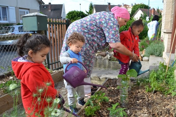 Nourrir les enfants avec les fruits et légumes de leur jardin en permaculture. Tel est l’objectif de Valérie Chafik, Hassina Ferhoune et Samia Bayodi, les trois « nounous » d’Orge’Mômes, dans le quartier populaire d’Orgemont à Épinay-sur-Seine (Seine-Saint-Denis). Cette idée a fait son chemin petit à petit, depuis la création de l’association fin octobre 2013 et l’ouverture de la maison d’assistantes maternelles (MAM) en janvier 2014. « Je me nourris de produits absolument toxiques que j’appelle du pétrole en barre, rigole Valérie Chafik. Je refuse que les enfants mangent comme moi et pensent que les légumes poussent dans les sachets de surgelés au supermarché. »