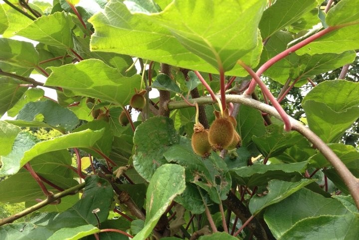 Quelle surprise ! Au milieu de la vigne et des branches, se trouvaient des Actinidia deliciosa, une liane originaire de la vallée du Yangzi Jiang, en Chine, donnant les arbres à kiwi. A force de travail et de patience, les fleurs ont été fécondées et aujourd’hui une vingtaine de petits fruits se balancent au gré du vent.