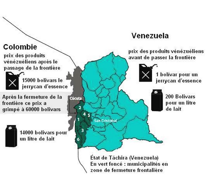 Depuis des années, les réseaux de contrebandiers extraient chaque jour 30 % des produits subventionnés par le gouvernement bolivarien pour les revendre en Colombie au décuple, au centuple, avec la complicité de nombreux fonctionnaires des deux pays, militaires comme civils. Des millions de litres d’essence (alors que le Venezuela n’exporte pas de carburant en Colombie), des milliers de tonnes d’aliments, de médicaments, de véhicules et de pièces de rechange… jusqu’aux billets de banque vénézuéliens eux-mêmes, vendus au-delà de leur valeur pour repartir acheter dans le pays voisin tout ce qui peut faire du bénéfice en Colombie. Un député colombien a dénoncé que des hôpitaux de Bogota font main basse sur les médicaments à bas prix destinés aux patients vénézuéliens, pour les revendre à leurs patients au prix du marché. 70 % des habitants de Cucuta, ville-frontière avec le Venezuela, vivent à temps plein de la manne du socialisme bolivarien, avec un bénéfice mensuel estimé à 9 milliards de dollars. (1)