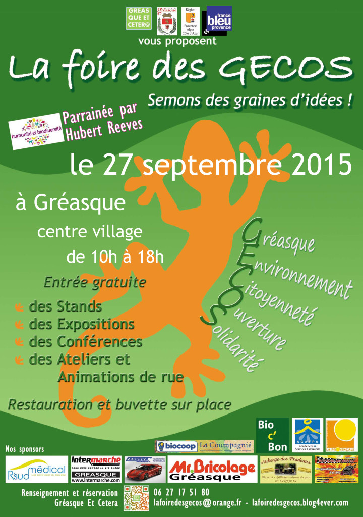 La Foire des GECOS, organisée par l’association Greasque Etceter@, est une journée de sensibilisation à l’environnement et à la solidarité. Rendez-vous dimanche 27 septembre 2015, de 10h à 18h, au centre du village de Gréasque (France).
