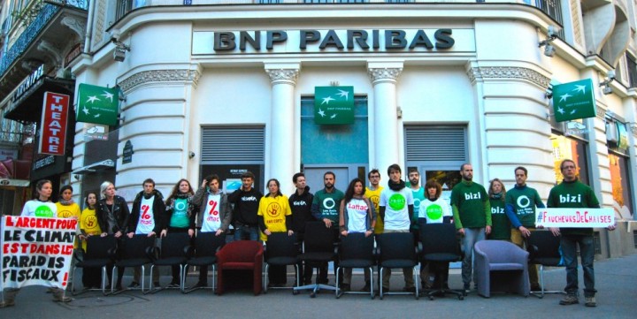 Ce matin, à 9 h 30 heures, 30 militant·e·s de divers mouvements et organisations (Bizi !, Attac, les Amis de la Terre, les J.E.D.I for Climate, le processus Actions Non-Violentes COP21, les Désobéissants) ont réquisitionné 12 chaises dans une agence de la BNP Paribas située boulevard de Strasbourg à Paris. A visage découvert et dans le calme, les militants ont montré leur détermination à s’opposer à l’évasion et à la fraude fiscales organisées par les banques. « Nous n’acceptons pas cette situation où on laisse les banques pratiquer en toute impunité l’évasion fiscale et faire évader des milliards d’euros d’autant plus que dans le même temps les impacts de la crise climatique s’aggravent faute d’un manque cruel de financements » affirme Thomas Coutrot, porte-parole d’Attac.