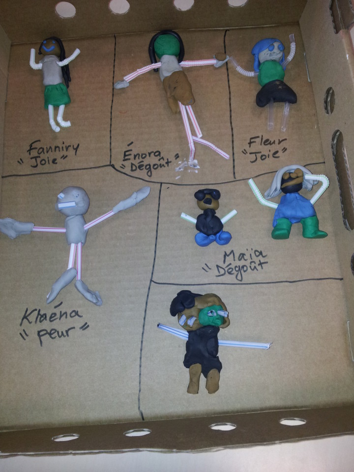 Et puis ils ont découvert leurs émotions, comment il est possible de passer de la tristesse à plus de joie simplement en changeant sa position corporelle, qu’est-ce qui fait que l’on a peur, que l’on est joyeux, triste ou en colère ! Les personnages du dessin animé Vice Versa nous ont bien aidés ! Mais aussi la pâte à modeler et les pailles ! Chaque enfant a choisi une émotion et l’a ainsi représentée. Faniri, une petite fille commence à exprimer sa colère vis-à-vis de sa sœur et, quelques minutes plus tard décide finalement de représenter la joie.