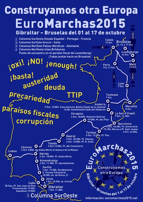 C’est pourquoi divers mouvements sociaux ainsi que des organisations politiques et syndicales avons planifié une action conjointe des peuples d’Europe, les EUROMARCHES 2015. Entre le 1er et le 17 octobre 2015 les peuples d’Europe se mobilisent vers Bruxelles pour demander un tournant radical dans les politiques de l’Union Européenne.