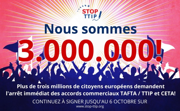 3,2 millions d’Européen·ne·s disent non aux traités transatlantiques TAFTA et CETA ! L’alliance citoyenne, qui remet aujourd’hui les signatures de l’initiative citoyenne européenne (ICE) Stop TTIP à Bruxelles, demande une réponse politique de l’Union Européenne.