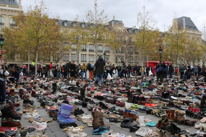 Des milliers de chaussures ont recouvert dimanche matin la place de la République à Paris, d’où devait partir la marche pour le climat, annulée après les attentats dans la capitale.