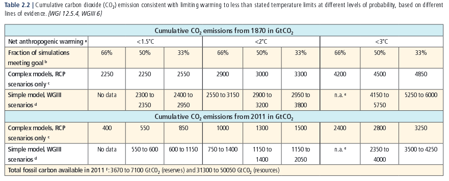 budget carbone pour différents objectifs de température (selon le 5e rapport du GIEC)