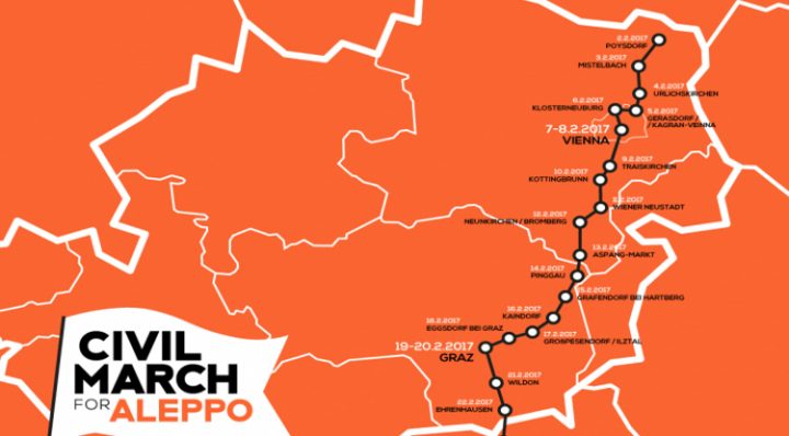 La Marche Civile pour Alep est un mouvement civil qui parcourt toute l’Europe, le long du chemin suivi par les réfugiés, en direction de la Syrie. C’est une initiative de solidarité qui, en même temps, encourage les participants à devenir actifs pour les réfugiés, pour la paix et pour la société civile en Syrie.