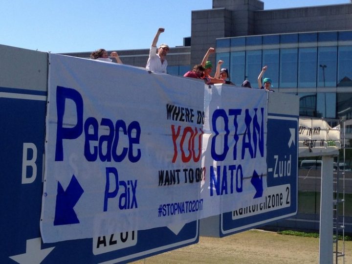Hier 25/05 dès 14h30 plus de 150 activistes ont perturbé l’arrivée des délégations au sommet de l’OTAN. Trois structures de panneaux de signalisation surplombant le trajet des délégations ont été occupées par une quarantaine de personnes. La police a pris plus d’une heure pour déloger les activistes ce qui a bloqué les principaux accès routiers menant au nouveau quartier général de l’OTAN.