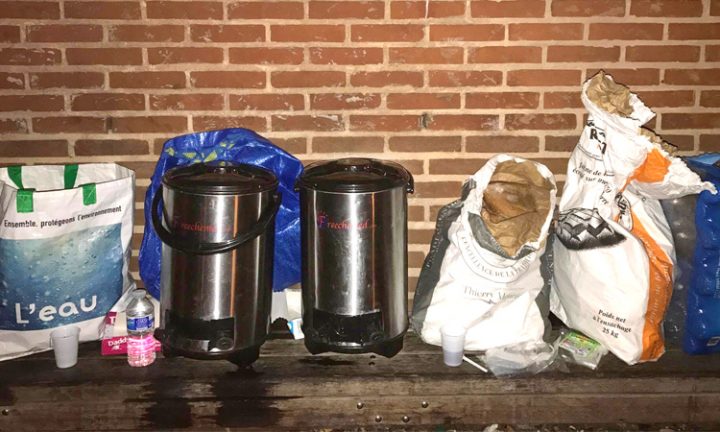 La première soupe de la saison est prête et Mahassine a récupéré beaucoup de pain chez son boulanger donateur. Combien de bols à acheter ? Des couvercles, des cuillères seront-ils nécessaires ? Les nouvelles bénévoles retrouvent les anciens à la porte de La Chapelle. Samba ne peut plus attendre de savoir s’il y aura de la place pour lui au squat et l’accès au parking va être fermé : il doit partir. La décision est prise de ne pas le laisser dormir à nouveau dans un sous-sol parisien. Il reste avec Mahassine pour le moment. Nous découpons les baguettes avant de partir… où ? Devant France Terre d’Asile ou à La Plaine Saint-Denis ? Nous consultons Q., bénévole majeur du quartier qui distribue jusque tard dans la nuit avec B. les repas que ce dernier prépare. Finalement, nous nous installons au Rond-point de La Chapelle et B. complètera là où nous n’irons pas. Samba se joint à nous. Mahassine hésite et installe sa table ici. Une file d’attente comme elle n’en avait pas vue depuis longtemps se forme. Impossible de rester ici ! La table de Mahassine empêche les autres associations de passer. Mahassine retire la table, puis la repousse sur le trottoir, ici, là… La faim rend impatient ; la file se déplace, s’agite. Les gars se plaignent beaucoup – à raison.