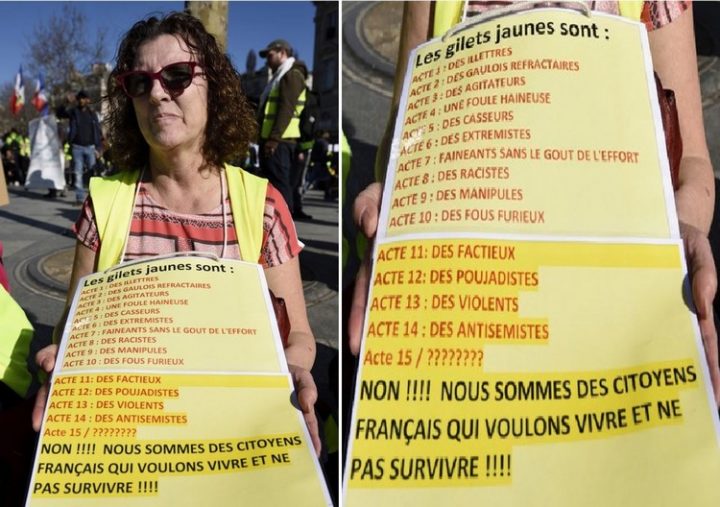 Les Gilets jaunes sont : des illettrés (acte 1), des gaulois réfractaires (acte 2), des agitateurs (acte 3), de foule haineuse (acte 4), des casseurs (acte 5), des extrémistes (acte 6), des fainéants sans le goût de l’effort (acte 7), des racistes (acte 8), des manipulés (acte 9), des fous furieux (acte 10), des factieux (acte 11), des poujadistes (acte 12), des violents (acte 13), des antisémites (acte 14), ???????? (acte 15).