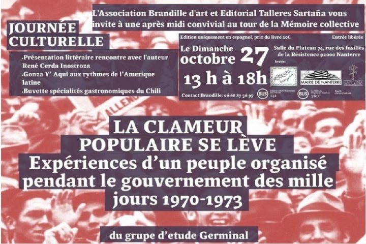 L’ Association Brandille Art vous invite le Dimanche 27 Octobre 2019 à un après midi Culturel au tour de la présentation du Livre et son auteur René Cerda Inostroza un jeune écrivain et Historien Chilien de passage en France.