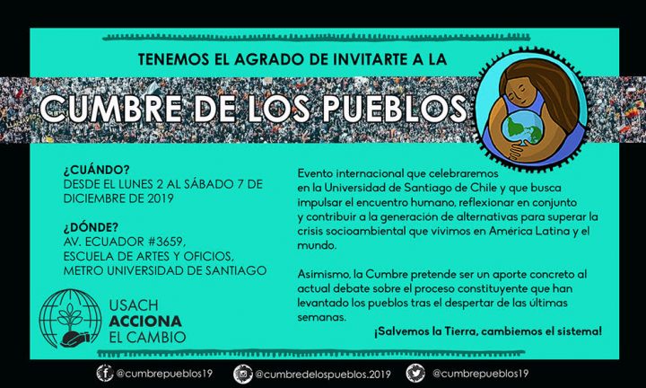 Après l’annulation du Forum de l’APEC et de la COP25, le Sommet des Peuples, rencontre internationale à laquelle participent plus de 200 organisations environnementales, écologiques, spirituelles, sociales et politiques, a décidé de maintenir sa réalisation. Malgré le changement de la ville hôte, le sommet va élever sa propre voix depuis les communautés, territoires et organisations en ce qui concerne la crise climatique, et le modèle économique néolibéral et extractiviste.