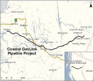 Coastal GasLink, un pipeline de 675 kilomètres, doit transporter du gaz naturel entre la région de Dawson Creek et les installations de LNG Canada prévues à Kitimat. Le projet a bénéficié de l’aval du gouvernement de la Colombie-Britannique et d’un soutien exceptionnel du fédéral, lequel a octroyé l’investissement le plus important du secteur privé dans l’histoire du Canada.(Radio Canada)
