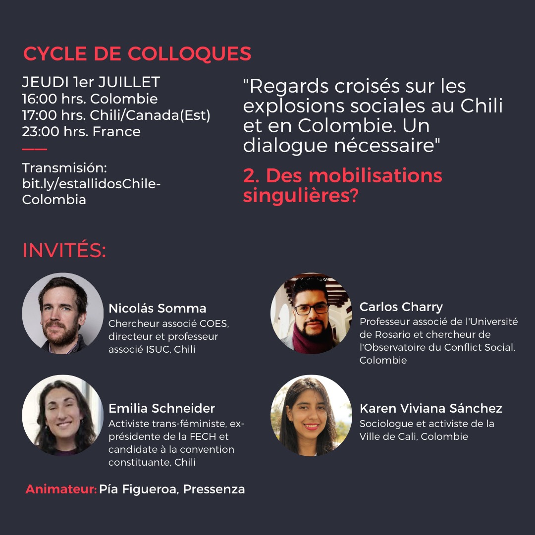Ce cycle de conférences, qui aura sa deuxième rencontre le 1er juillet (16h Colombie, 17h Chili et Canada (Est), 23h France), cherche à partir de cinq axes de réflexion, à proposer un dialogue nécessaire entre les réalités du Chili et de la Colombie, afin de trouver des pistes d’analyse et des solutions qui permettent de mieux situer le phénomène dans une perspective comparative à travers les voix des chercheurs et des activistes qui ont travaillé sur et au sein de ces mouvements.