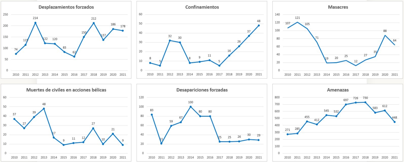 Le paradoxe est qu’à partir de 2017, au moment même où la mise en œuvre de l’Accord de Paix et des politiques dites de post-conflit a commencé, les chiffres de la violence ont à nouveau augmenté. Cette fluctuation se reflète dans les différents indicateurs consolidés par le Bureau des Nations Unies pour la Coordination des Affaires Humaines (OCHA).