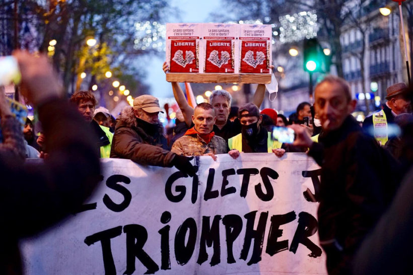 Dans la foule, des citoyens contre l’obligation et le pass-sanitaire. Les gilets jaunes réclament une justice sociale et fiscale, une démocratie directe et participative, une réécriture de la constitution, la fin des avantages et privilèges des élus. Également, une baisse du prix du gaz et de l’essence et s’opposent à la réforme des retraites et du chômage.