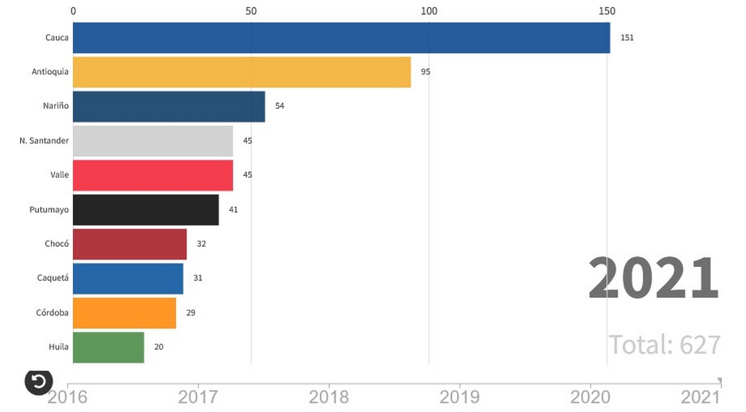 L’image montre le nombre d’homicides de dirigeants sociaux pour 2021. Voir la variation entre les années 2016 et 2021 sur ce lien, à la fin de l’article.