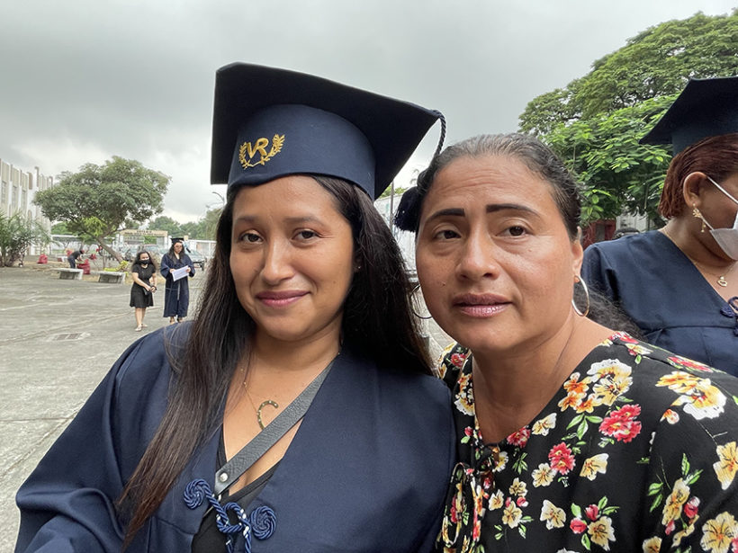 Une étudiante adulte est félicitée par ses deux enfants lors de la cérémonie de remise de son diplôme de bachelière (Image de Walker Vizcarra).