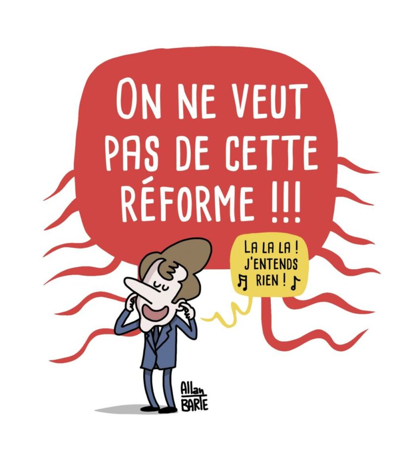 Un grand merci au dessinateur Allan Barte, qui met ses dessins contre la réforme des retraites gracieusement à disposition pour soutenir la lutte !