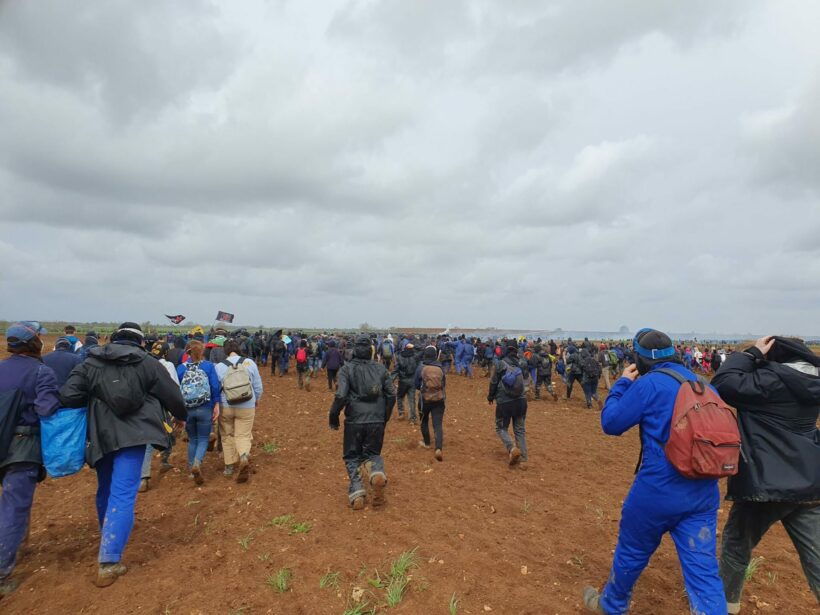 Vers 2 heures du matin, dodo et à 7h30, réveil pour pouvoir partir à 8h. Finalement, le départ s’organise à 10h, en trois convois à pied vers la bassine (une dizaine de kilomètres). Au moins trois mille personnes se trouvaient au campement et plus de 20 000 personnes ont participé à l’action.