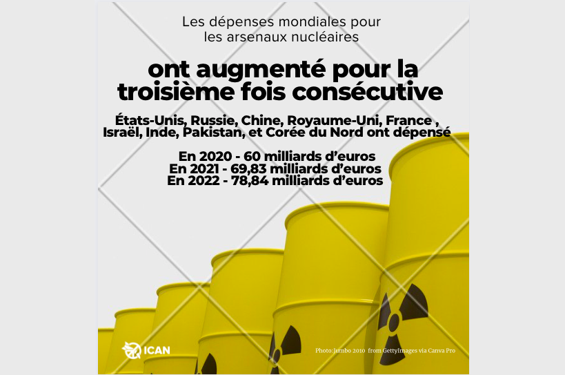 En 2022, les États dotés d’armes nucléaires (États-Unis, Chine, Russie, Grande-Bretagne, France, Israël, Inde, Pakistan, Corée du Nord) ont dépensé cinq mille dollars supplémentaires par minute (environ 4 500 euros) pour leurs arsenaux nucléaires par rapport à l’année précédente. Au total, cela représente une dépense de 157 664 dollars (149 938 euros) par minute pour les armes nucléaires. Ces neuf pays totalisent des dépenses militaires liées aux arsenaux nucléaires de 82,9 milliards de dollars (78,84 milliards d’euros) en 2022, avec une augmentation pour le secteur privé d’au moins 29 milliards de dollars (27,57 milliards d’euros).