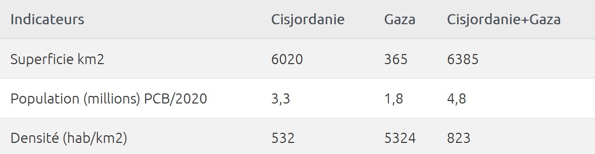 Taux de pauvreté : Cisjordanie : 13,9 % Gaza : 53 % (2020, PBCS) [2]Selon l’UNRWA [3], 80 % de la population gazaouie dépend de l’aide humanitaire