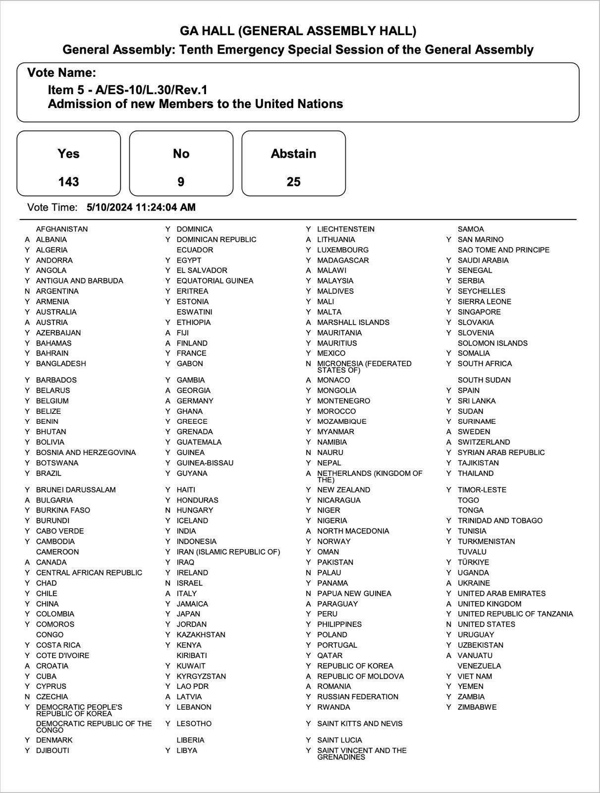 Le détail du vote obtenu de cette résolution de l’Assemblée Générale, diffusé sur la toile (voir hyperlien) est reproduit ci-contre. Au cours de ce vote, Israël et les Etats Unis n’ont pu recueillir que sept votes contre avec les leurs: