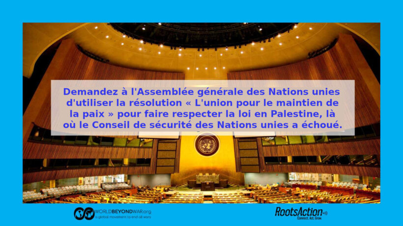 La résolution 377 de l’Assemblée générale des Nations unies (Uniting for Peace – L’union pour le maintien de la paix) permet à l’Assemblée générale d’agir en cas d’échec du Conseil de sécurité. L’Assemblée générale ne doit PAS intensifier la guerre ni déployer des troupes armées. Elle doit convoquer une session d’urgence et utiliser « L’union pour le maintien de la paix » pour imposer un embargo sur les armes et des sanctions ciblées au gouvernement israélien, suspendre le gouvernement israélien des Nations unies et envoyer en Palestine des gardiens de la paix non armés (qui ont montré à maintes reprises leur supériorité sur les gardiens de la paix armés).