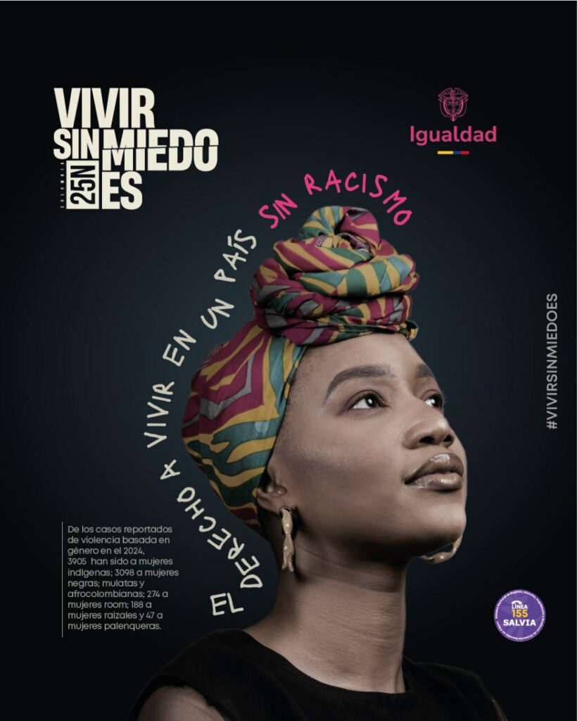 Texte en bas à gauche sur l’image : Parmi les cas de violence de genre signalés en 2024, 3095 concernaient des femmes indigènes, 3098 des femmes Noires, Mulâtres et Afro-colombiennes, 274 des femmes Rom, 188 des femmes Raizal et 47 des femmes Palenquero.