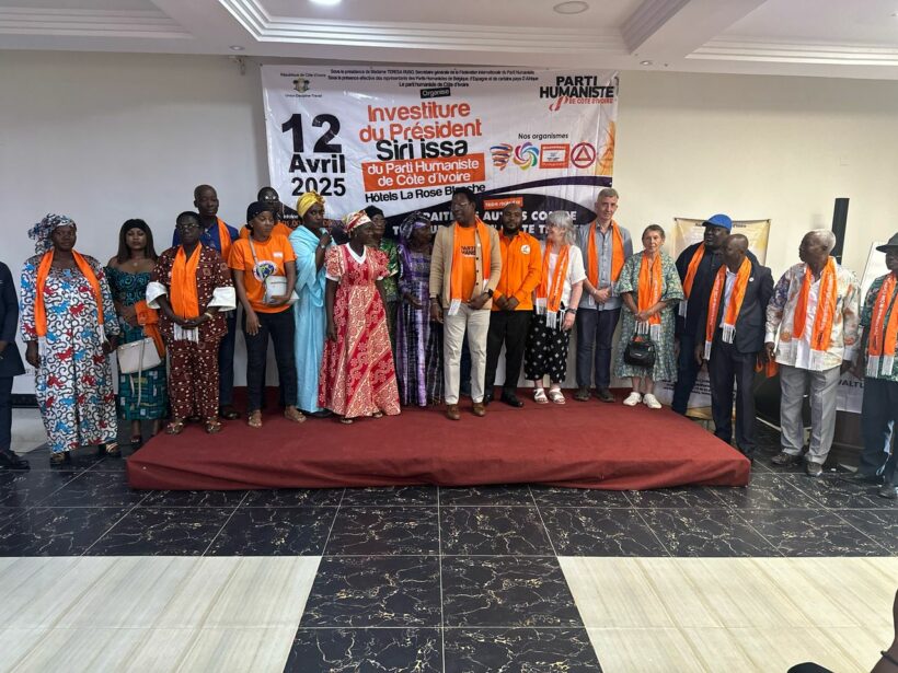 Le Parti Humaniste de Côte d’ivoire (PHCI) annonce les couleurs orange sur le sol ivoirien le samedi 12 AVRIL 2025 à l’hôtel la Rose Blanche dans la commune de Cocody – Mahou en présence de TERESA RUSO, secrétaire générale de la Fédération Internationale du Parti Humaniste (FIPH), de Fernando Rodriguez du Parti Humaniste d’Espagne et de Gilles SMEDTS du Parti Humaniste de Belgique.