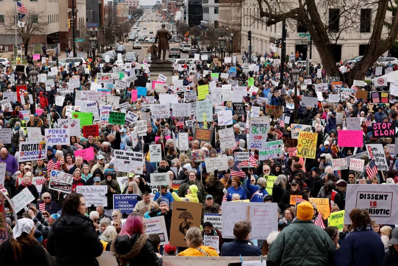 Plus d’un million de personnes sont descendues dans la rue samedi 5 avril dans le cadre des plus grandes manifestations depuis le retour du président Trump à la Maison Blanche. Plus de 1 400 manifestations sous le slogan « Bas les pattes ! » ont eu lieu dans les 50 États, ainsi que dans certaines villes d’outre-mer. Dans tout le pays, les organisateurs ont déclaré que le taux de participation était beaucoup plus élevé que prévu. Certaines des manifestations les plus importantes ont eu lieu à Washington, D.C., New York, Chicago, Los Angeles, Denver, Boston, Philadelphie et Atlanta. À Washington, la représentante démocrate du Minnesota, Ilhan Omar, a pris la parole.