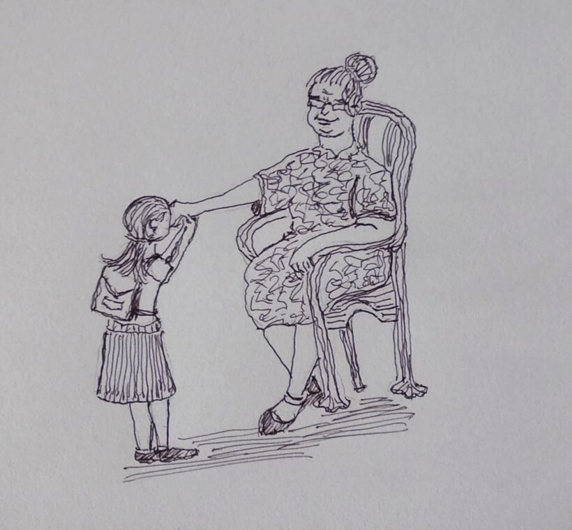 J’ai ressenti une poussée d’émotions et de sentiments positifs dans mon corps, mon cœur et mon esprit. J’ai salué le trio qui me regardait, leur envoyant mes meilleurs vœux juste avant qu’ils ne se retournent et continuent à marcher devant eux, rentrant chez eux sains et saufs, je l’espérais ! Je me suis sentie bénie et heureuse de faire partie d’une culture qui honore, respecte et prend soin des personnes âgées. Je leur ai à nouveau adressé mes meilleurs vœux de bien-être et j’ai espéré que cette pratique ne disparaisse pas.