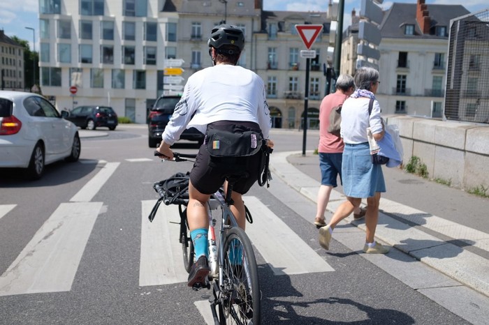 “Moi c’est Tom, je suis une personne trans, je suis blanc et de classe moyenne, c’est un peu pour me situer en termes de privilèges. Je trouvais ça important. Et après, mon parcours, un peu classiquement, j’ai fait une école d’ingénieur. Après, j’ai un peu bossé dans le bâtiment du coup. Et ensuite, j’ai été développeur web. Ensuite, je me suis trouvé une passion pour le vélo et j’ai un peu fait un truc que j’en avais marre. De ce que je faisais et que ça n’avait pas de sens pour moi, donc je suis devenue coursier à vélo. Du coup, ça fait deux ans maintenant que je suis coursier à vélo à Nantes. Bah en fait, j’ai commencé à faire du vélo avec des potes.