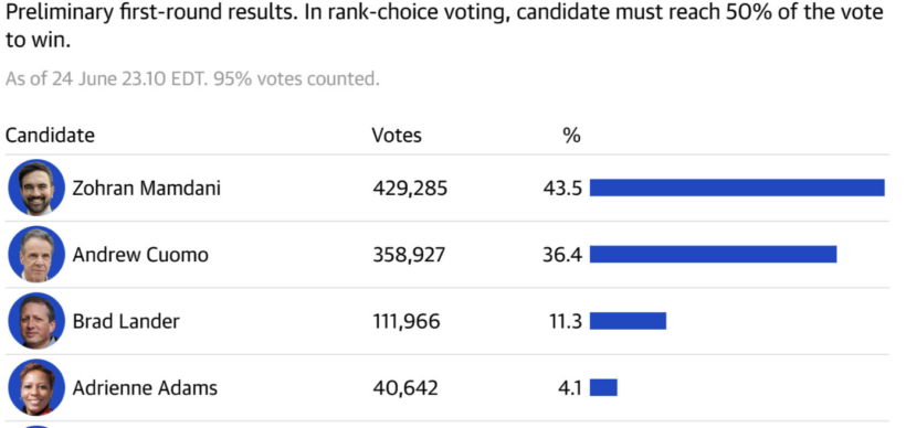 Les résultats, confirmés par le système de vote préférentiel de New York, ont porté un coup décisif à l’establishment démocrate. Dans ce système, les électeurs classaient jusqu’à cinq candidats par ordre de préférence. Si aucun candidat n’obtenait plus de 50 % des votes de premier choix, les candidats les moins bien classés étaient éliminés par tours, les voix étant redistribuées jusqu’à l’obtention d’une majorité. Le système de vote préférentiel a joué un rôle crucial dans la victoire de Mamdani, permettant aux coalitions progressistes de se consolider sur plusieurs tours.