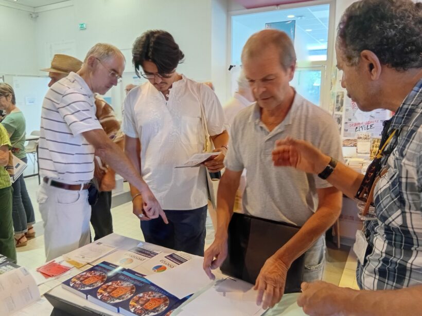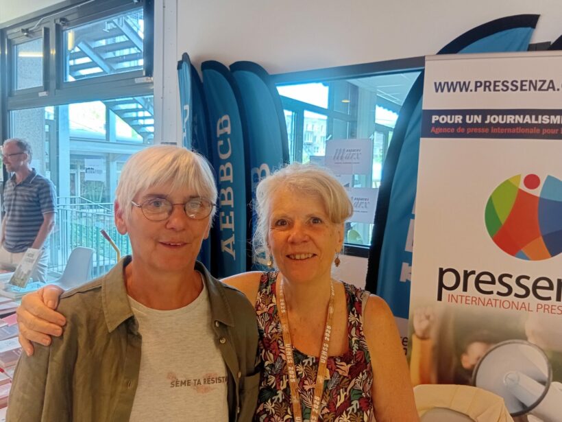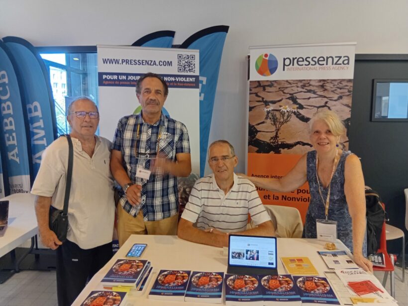 Avec Pressenza, nous sommes présents avec un stand. L’occasion de croiser de nombreux lecteurs et partenaires de Pressenza ! « Oui, bien sûr, je connais Pressenza ! je viens de publier un article ! » nous explique un collaborateur ; « bien sûr, j’ai collaboré au livre sur le journalisme non-violent, nous explique un autre … » Puis d’autres, qui ne connaissent pas encore, s’interrogent quant à ce que signifie aujourd’hui la non violence, dans un monde tellement violent …, partagent leur engagement et encouragent Pressenza : « vous êtes très importants pour nous faire connaître au-delà de notre action locale ! »