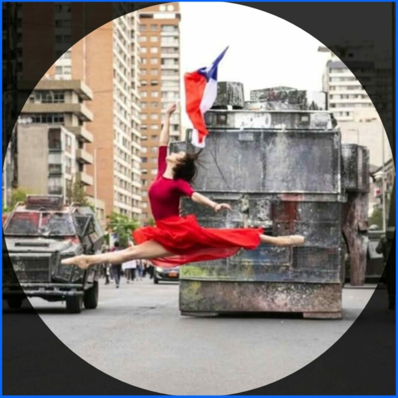 L’image est bouleversante et sublime. Une ballerine en plein grand jeté, suspendue en l’air avec un drapeau chilien flottant au-dessus de sa tête, tandis qu’en arrière-plan s’élève un canon à eau et un camion de munitions : symbole de la répression étatique criminelle à Santiago du Chili en 2019. Le rouge de sa robe coule comme une blessure vive. Son corps, en tension parfaite, ne fuit pas : il affronte vêtu de sa seule armure extérieure, un tutu, car l’autre était portée dans l’esprit. Elle, toute entière — son corps, son âme, sa danse — s’est élevée face à l’infamie, en pleine rue, et tout cela à la fois fut la barricade humaine de ce jour-là.