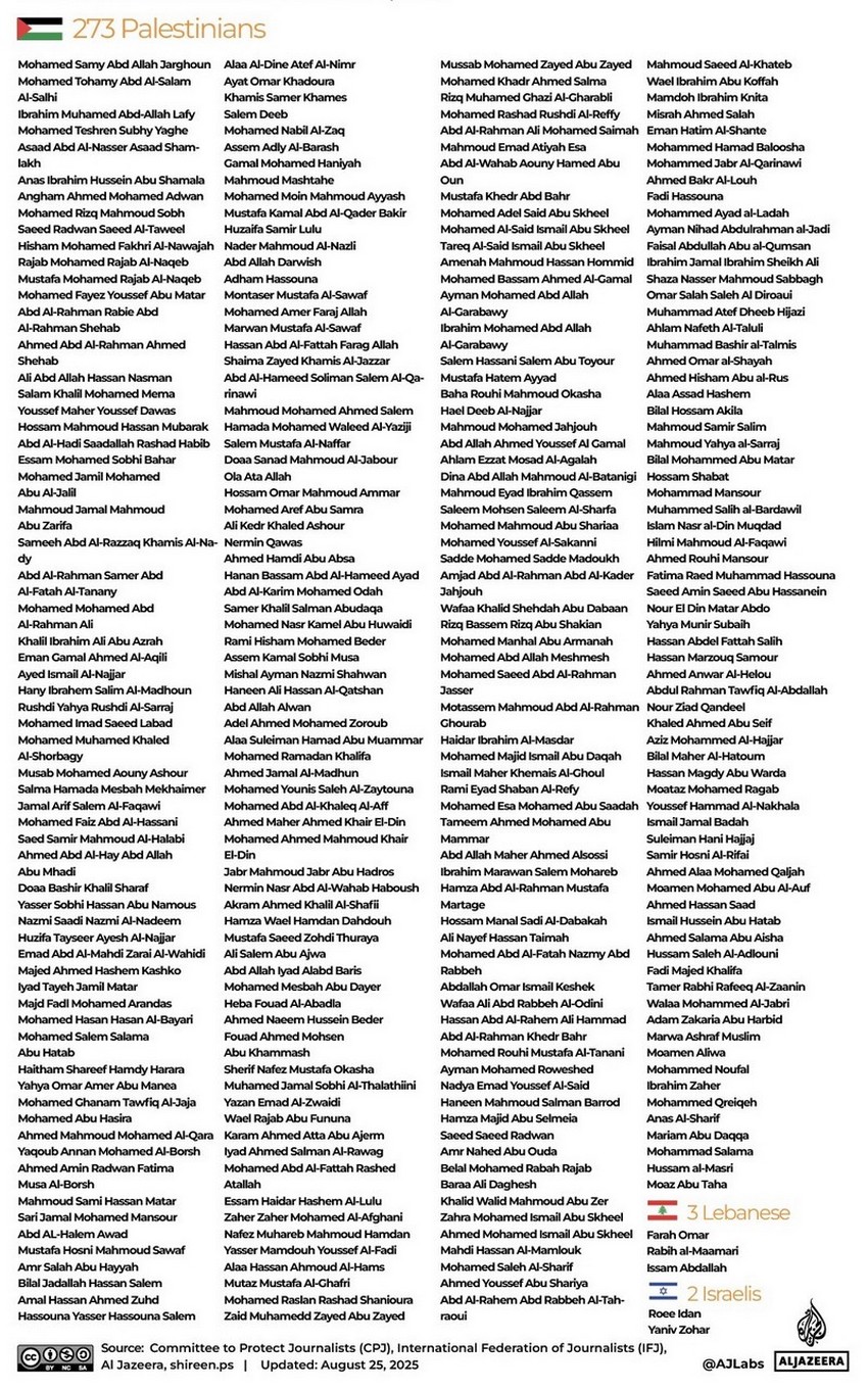 Journalistes tués depuis le 7 octobre 2023 Au moins 278 journalistes et membres des médias, en majorité des Palestiniens, ont été tués dans la guerre qu’Israël mène à Gaza. Voir les visages de ces personnes.