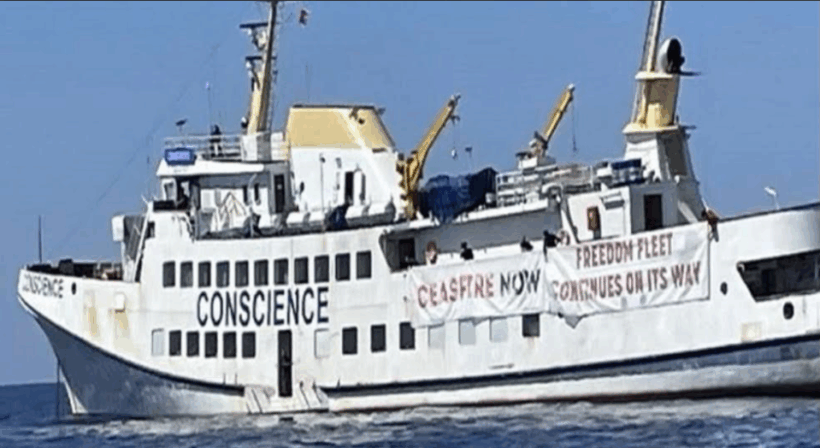 Tous les membres de la mission à bord du navire Conscience sont sains et saufs. Dans environ deux jours, le bateau sera avec d’autres dans les eaux territoriales de la Palestine, s’ils ne sont pas stoppés ou carrément séquestrés illégalement par Israël.
