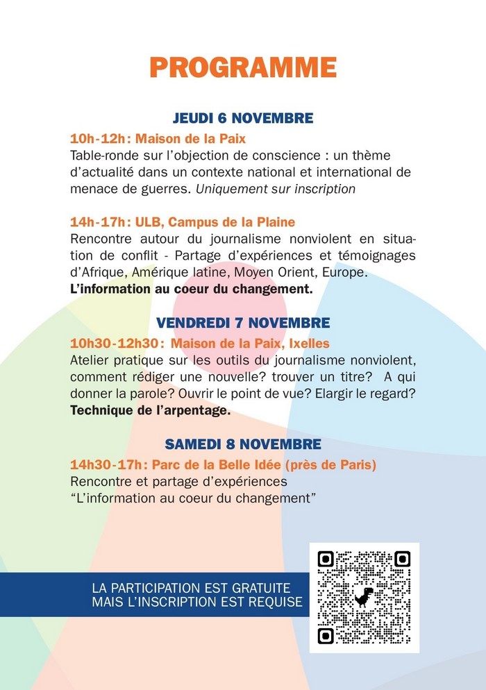 Vendredi 10h30 – 12h30 : atelier pratique sur le journalisme non-violent : Maison de la Paix (Ixelles) ; Passons au concret ! Avec la technique de l’arpentage, nous utiliserons le livre-guide « pour un journalisme non-violent » et aborderons des questions telles que : comment choisir un titre ? Rédiger un article ? Choisir une photo ? Aborder un thème avec une perspective d’espoir ? Cet atelier est ouvert à toute personne souhaitant collaborer au journalisme non-violent.