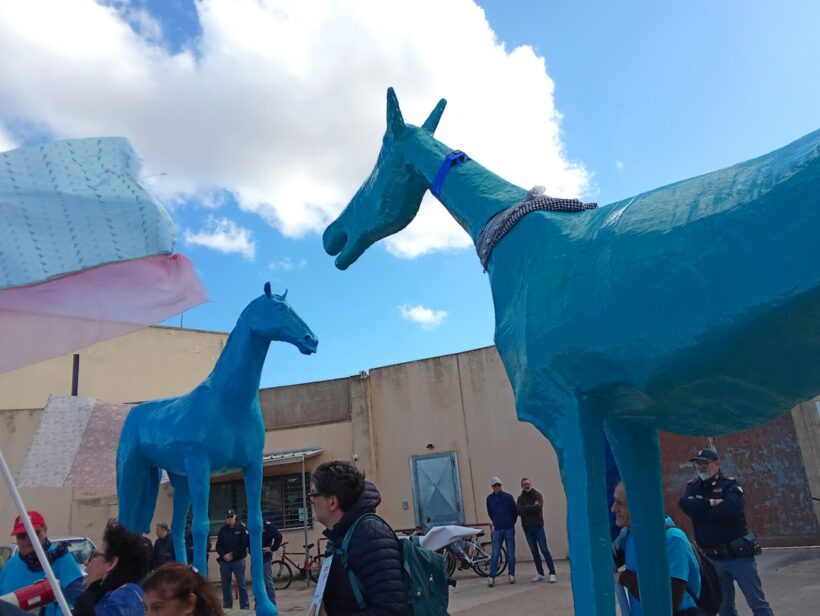 À l’extérieur, les deux chevaux bleus attendaient eux aussi, incarnant le cri collectif contre ces lieux de déshumanisation et de criminalisation des migrants. Ils ont ensuite regagné Latiano, avant qu’un cortège vivant et très suivi ne se déploie dans l’après-midi dans les rues du centre de Brindisi, mêlant engagement civique, mémoire et expression artistique.