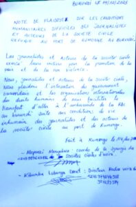Nous, journalistes et acteurs de la société civile, nous demandons l’intervention du gouvernement burundais et des organisations internationales des droits humains afin de nous faciliter notre transfert à l’ambassade de la RDC au Burundi suite aux conditions de vie inhumaines des journalistes et des acteurs de la société civile au port de Rumange.