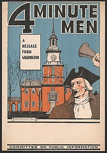 Les salles de cinéma étaient combles et le CPI formait des milliers d’orateurs bénévoles pour prononcer des discours patriotiques pendant les entractes de quatre minutes nécessaires au changement de bobine. Ils prenaient également la parole dans les églises, les loges, les organisations fraternelles, les syndicats et même les camps de bûcherons. Les discours étaient principalement prononcés en anglais, mais les groupes ethniques étaient touchés dans leurs propres langues. Creel se vantait qu’en 18 mois, ses 75 000 bénévoles avaient prononcé plus de 7,5 millions de discours de quatre minutes devant plus de 300 millions d’auditeurs dans un pays de 103 millions d’habitants. Les orateurs suivaient des formations dans les universités locales et recevaient des brochures et des conseils pour aborder une grande variété de sujets. Des historiens étaient chargés de rédiger des brochures et des ouvrages historiques approfondis sur les causes de la guerre en Europe.