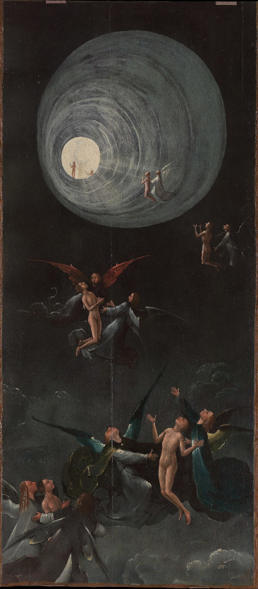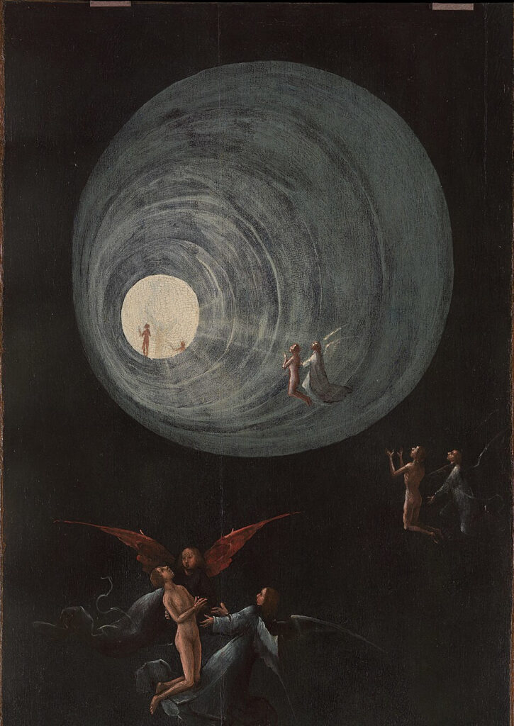 • Observant leur corps avec détachement pendant leur ascension, ils perçoivent les conversations proches, entendent clairement le médecin déclarer qu’ils sont morts, le voient entreprendre des massages cardiaques, des compressions thoraciques, et savent qu’ils sont sortis de leur corps ; certains ont conscience d’être uniquement des esprits capables de voir, de penser et d’entendre. Ils ressentent un sentiment de félicité, découvrent qu’il y a beaucoup d’humour là-haut, n’éprouvent aucune douleur, et ne veulent parfois pas réintégrer leur corps ; certains le détestent, le trouvent moche ! Ils traversent les portes, peuvent se trouver partout simultanément, le temps et l’espace sont abolis, c’est un éternel présent. Ils se sentent alors attirés par un tunnel, ou un couloir sombre (voir ci-dessous le tableau de Jérôme Bosch)(2), au bout duquel brille une Lumière bienfaisante, accueillante, pleine d’amour ; les qualificatifs sont nombreux et tous laudatifs. Ils sont accueillis par leurs parents décédés, ont le sentiment que l’enfer c’est la séparation d’avec Dieu, d’avec la Lumière. Cette Lumière qui est omniprésente, enveloppante, grâce à la fusion dans laquelle ils accèdent à l’omniscience, la connaissance approfondie de toute chose, et l’enfer ne serait rien de plus que la souffrance ressentie par qui a accompli le mal sur terre.
