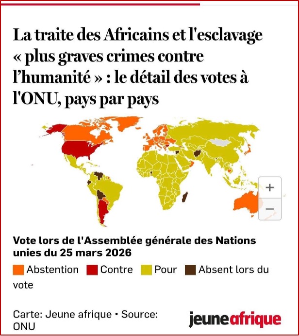 Le 25 mars 2026, les Nations unies, par une déclaration solennelle de son assemblée générale (AG/12755), adoptent une résolution historique : celle qualifiant l’esclavage et la traite transatlantique des esclaves africains de «plus grave crime contre l’humanité ». (cf. lien n°1).