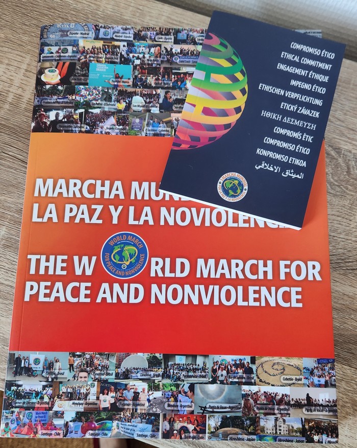 Cette journée a été l’occasion de partager nos expériences de différentes actions en faveur de la paix, notamment la Marche Mondiale pour la Paix et la Nonviolence[4] et d’offrir aux marcheur·euse·s  l’Engagement Éthique, un texte en plusieurs langues qui appelle à mettre les connaissances, les compétences, les progrès de la science au service de la Vie.