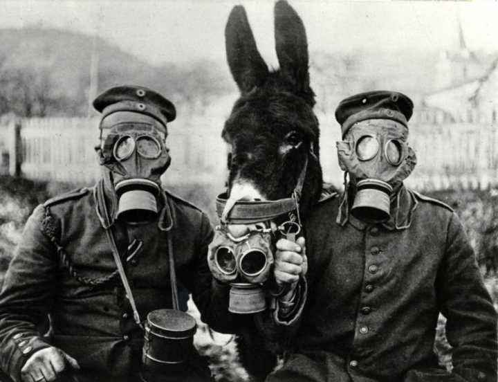 Ce n’est pas le cas ici de faire l’histoire [2]. Les gaz n’étant pas fiables car ils dépendent de conditions météorologiques variables, il est passé aux balles d’artillerie contenant des agents chimiques. On estime qu’environ un tiers de toutes les balles d’artillerie contenaient des agents chimiques, soit 66 millions de balles pendant la Grande Guerre ! Du chlore au phosgène, en passant par le gaz moutarde, etc. Impressionnantes sont les photographies que l’on trouve en abondance de soldats portant des masques à gaz, et même de mules portant des masques, ainsi que celles, dramatiques, des rangées de morts dans les tranchées.