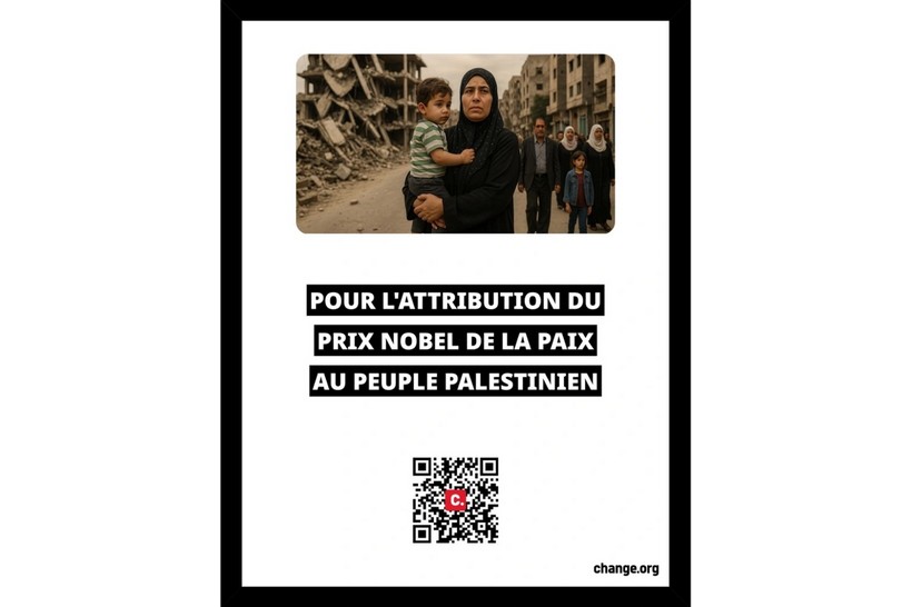 Signez pour que le comité Nobel reconnaisse la dignité et la résistance pacifique d’un peuple martyrisé. Depuis plus de 75 ans, le peuple palestinien subit occupation, colonisation, blocus, bombardements, exil. Et pourtant, il continue de défendre sa dignité, de vivre,…